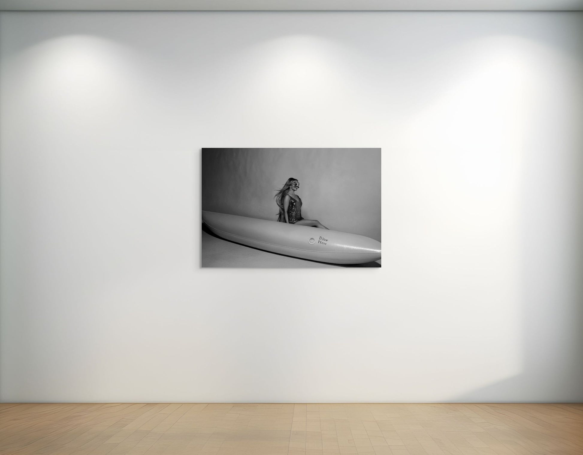 A glamorous figure sits poised on an inflatable vessel, her beauty framed as both spectacle and expectation. The directive printed on the boat becomes a reversal – nothing about her is meant to be inflated, only the object that carries her.