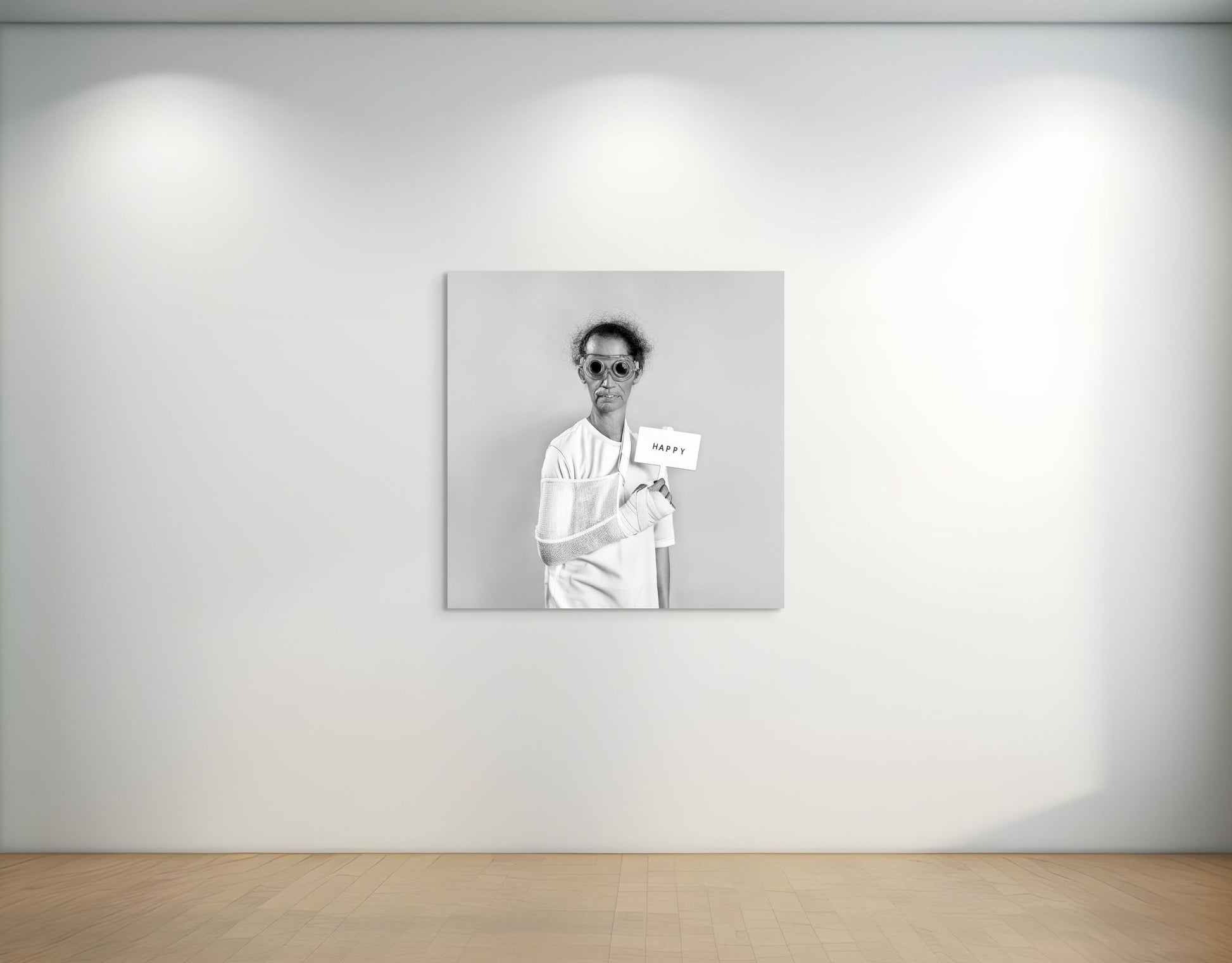 Happy, Apparently takes a look at social perception and the performance of wellness. The bandages and goggles introduce a body that has endured something unspoken, standing upright inside its own contradiction. The word Happy becomes both mask and demand, a performance of ease delivered by someone visibly strained. The truth is that forced optimism fractures the self, and honesty arrives only when the sign is lowered.