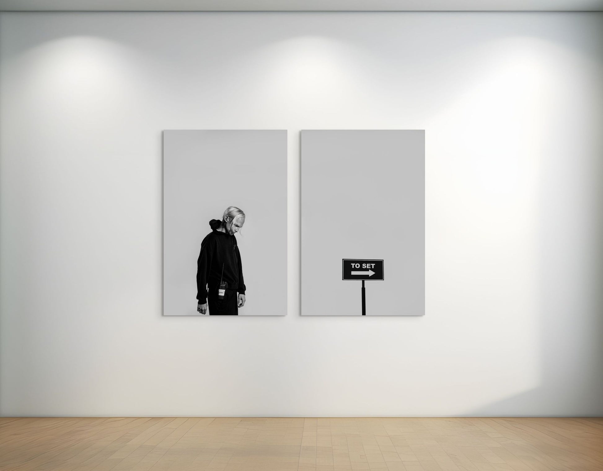 This diptych looks at the quiet disorientation of film-set life – the way you can follow every sign and still feel off the mark. The figure stands beside a directional placard, a body momentarily paused inside a machine that never stops. The subject stares down at the blank floor and reveals how easily purpose becomes routine, and routine becomes a stand-in for meaning. The radios, the hoodie, even the posture signal someone who is always “on,” even when there’s nowhere clear to go. The work stays with the truth that being guided is not the same as being grounded.