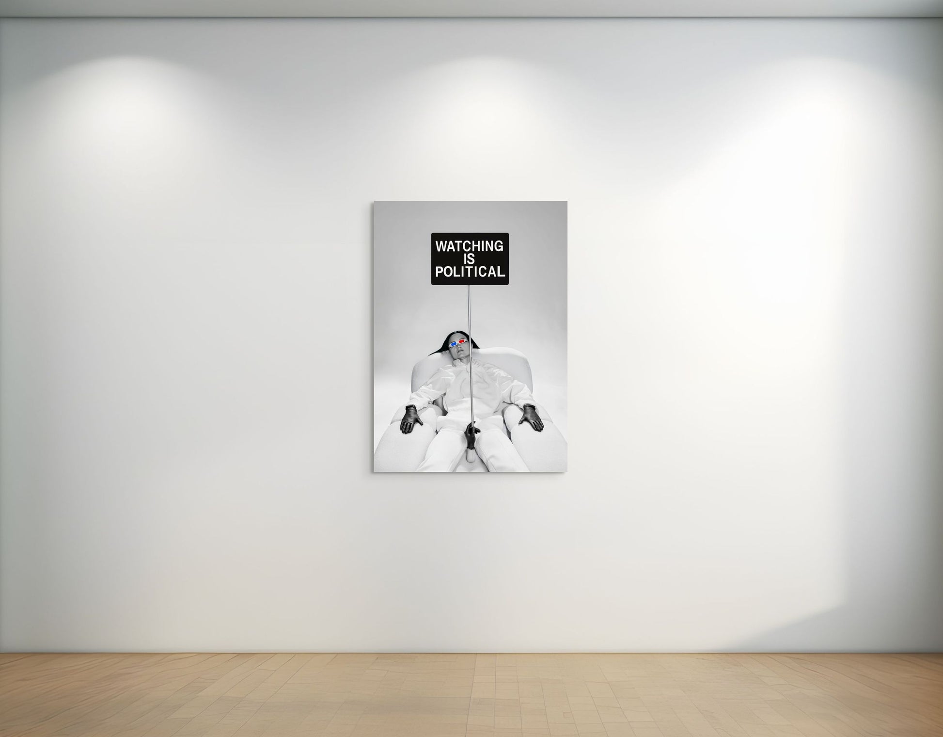 A hand hovers between protest and symbol, pointing toward the long history of who is allowed to frame meaning. The body becomes both viewer and viewed, caught in the loop of watching and being watched.